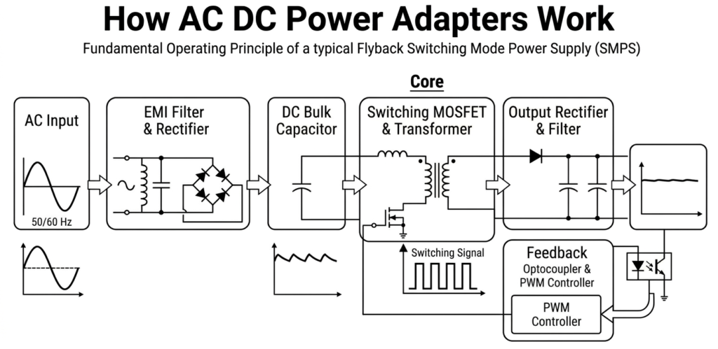 AC DC power adapters convert electrical energy through several stages to deliver stable DC output.